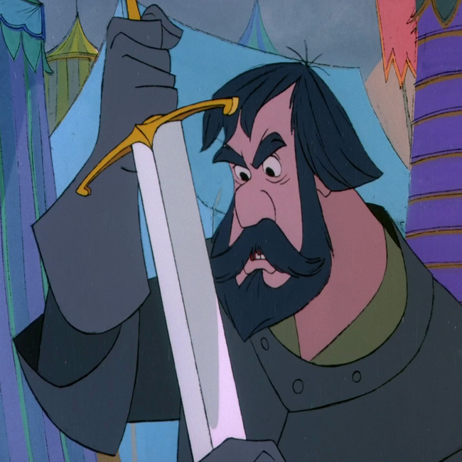 This is a picture of Sir Bart, the fictional character, the Black knight, who realizes Arthur has just drawn the Sword in the Stone in Sword in the Stone.